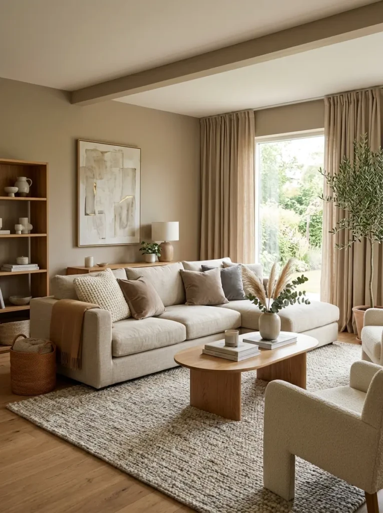 Texture is essential for comfort. Mix velvet cushions, knitted throws, boucle chairs, linen curtains, and woven baskets. Even a neutral room feels rich when multiple textures are present.